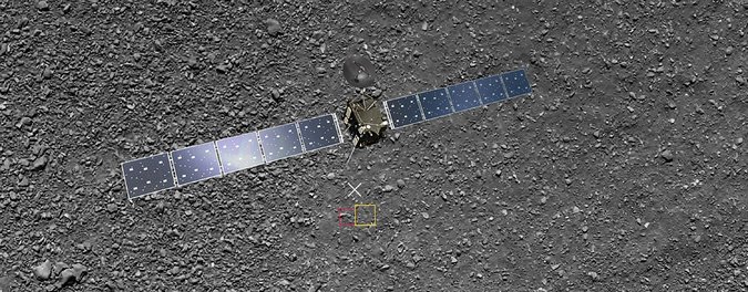 This photo shows a rendering of Rosetta above a real shot it sent back from about 1,000 feet above the surface of the comet. The red box indicates the ten foot square shown in the final photo.