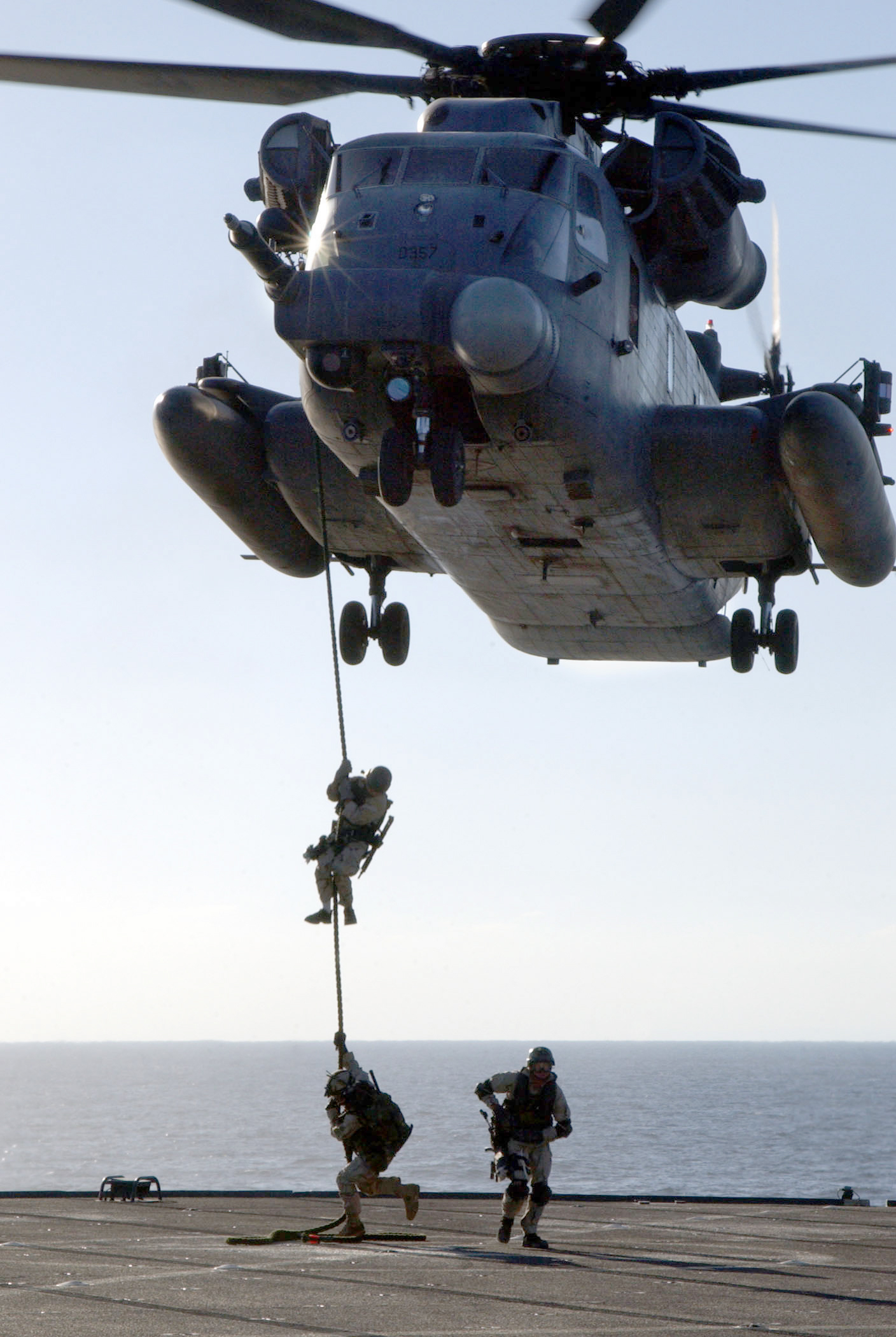 Naval Air Station Fallon, Nev. (Aug. 6, 2003) -- U.S. Navy SEAL (Sea, Air and Land) Team members secure a landing zone as part of a downed pilot scenario during Desert Rescue XI at Naval Air Station (NAS) Fallon, Nev. (Source: U.S. Navy photo, Public domain, via Wikimedia Commons)