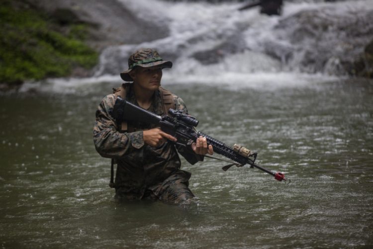 U.S. Marine Lance Cpl. Tristen Albers with Headquarters Battery, 12th Marine Regiment, 3rd Marine Division, crosses a river during the land navigation portion of the Basic Jungle Skills Course at the Jungle Warfare Training Center, Camp Gonsalves, Okinawa, Japan, August 6, 2019. The BJSC is a 5 day training event that encompasses the skills utilized in a basic jungle survival or combat environment. (U.S. Marine Corps photo by Lance Cpl. Joshua Sechser).