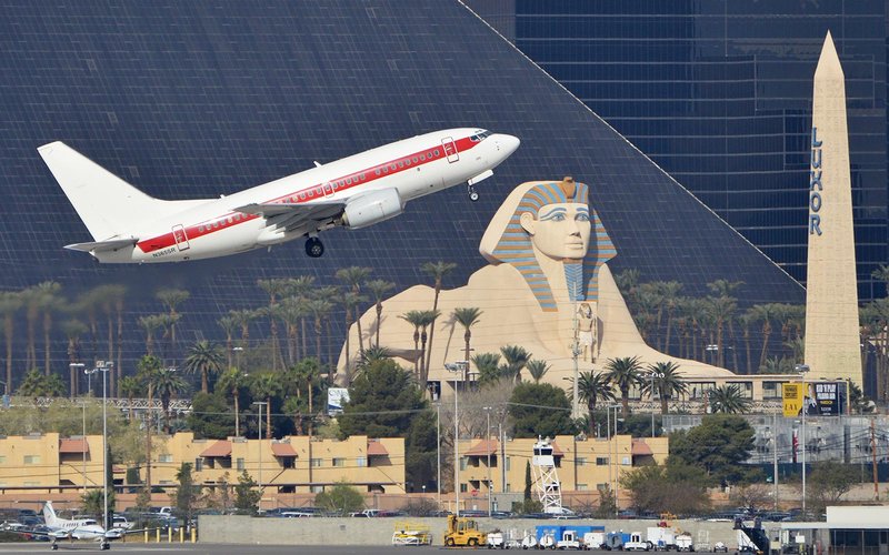 JANET Airlines, as they’re called, operates a small fleet of Boeing 737-600 jets with their own terminal at McCarran. The planes, which sport no airline name or logo, are fairly easy to pick out of a crowd thanks to their white paint adorned with a telltale red stripe down the side. JANET also operates two Beechcraft 1900s and three Beechcraft 200Cs, also painted white, but dressed up with blue stripes rather than red.