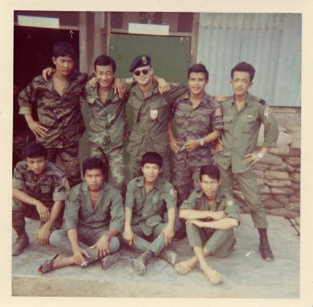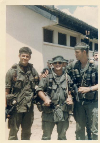During a break in training in Nha Trang during the summer of 1968. From left, fellow Green Berets and SOG recon men, Jeffrey Junkins, John Peters and David Badger.