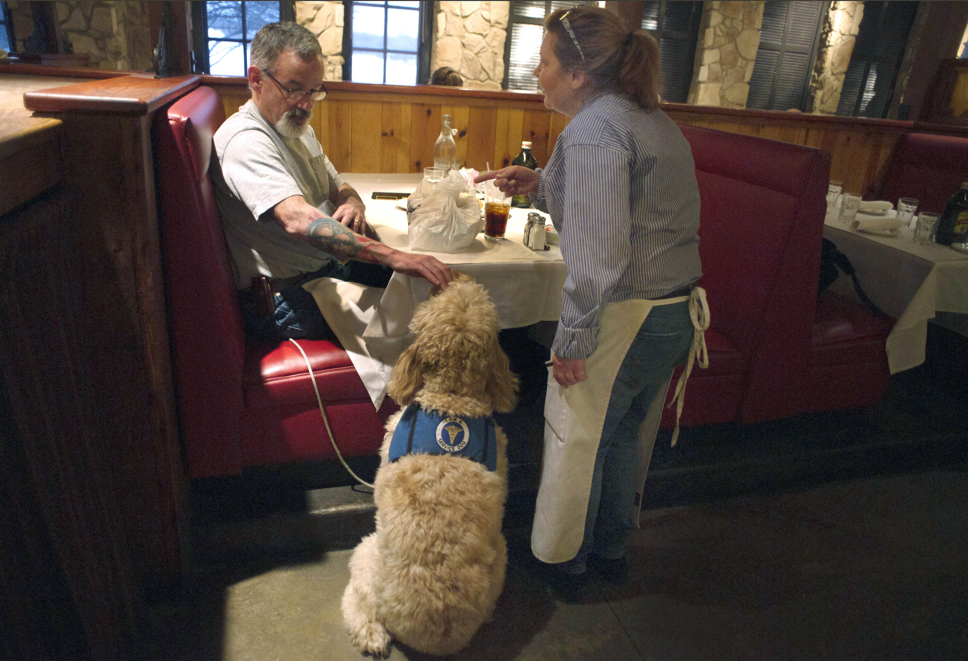 A waitress at the Macaroni Grill in South Portland, Maine, talks to customer Sean McDonough with service dog Bruno at his side. McDonough suffered brain injuries in a car crash in 2008 and depends on Bruno to keep him calm in public settings. When McDonough is stressed, Bruno will lean against him. Businesses are so fed up with the fakes that those of us with legitimate service dogs are being scrutinized and discriminated against, McDonough said. | AP Photo/Tom Bell