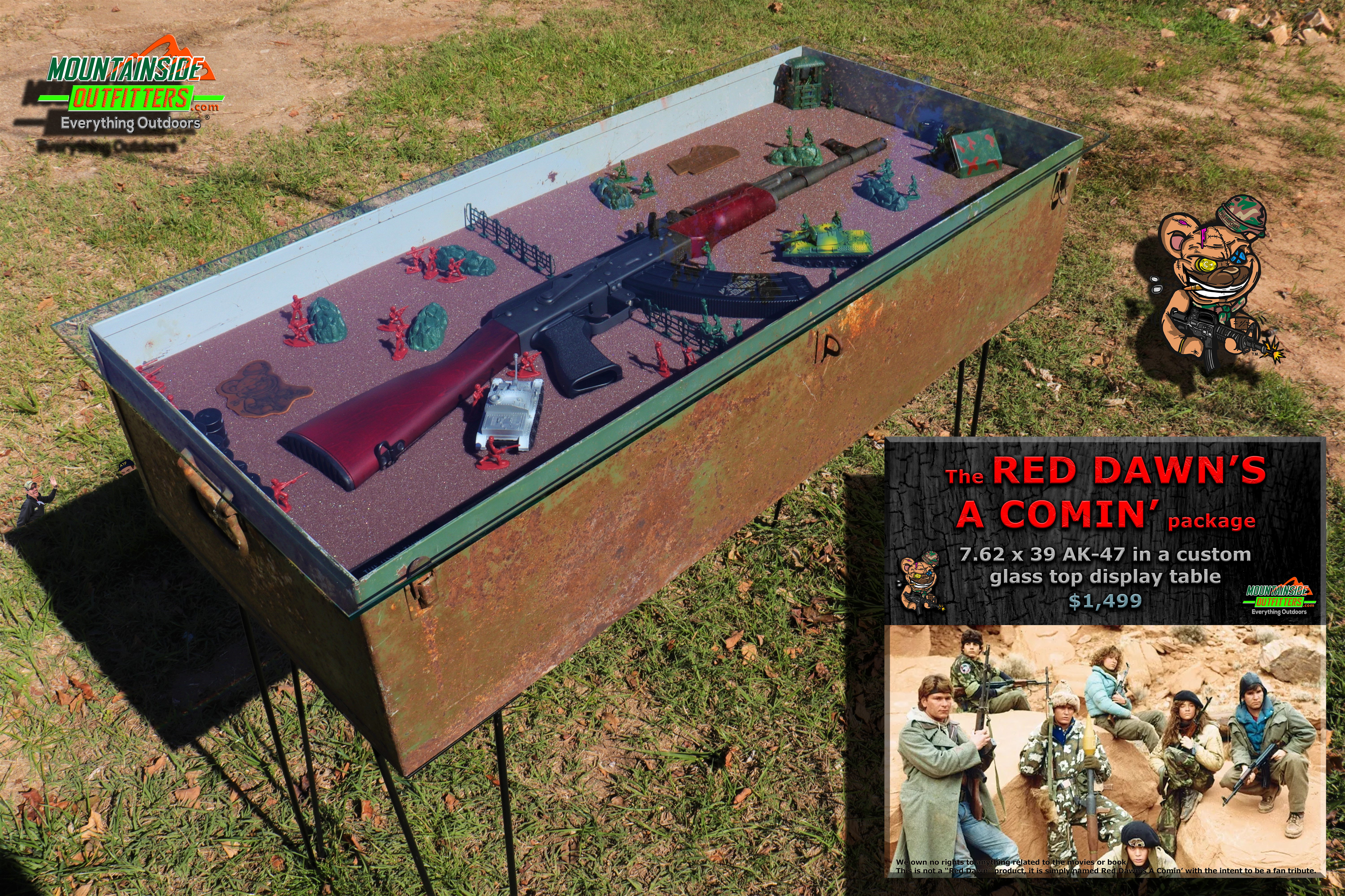 Finally, they have these wild art pieces that are furniture with dioramas inside of them along with firearms, like this coffee table, glass top display case for an AK47, called “Red Dawn’s A-Comin”