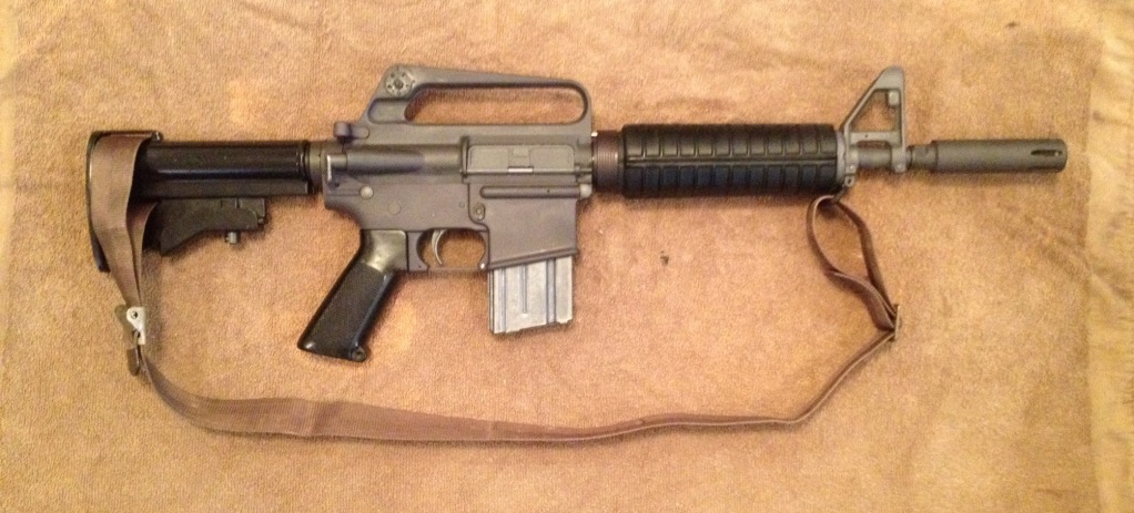 - Colt SMG with a 10.5-inch barrel with AimPoint T-1 mico