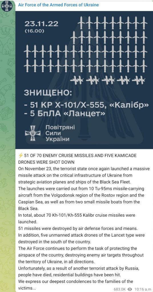 According to the Institute for Study of War (ISW), Russian armed forces continue their almost non-stop attacks on civilian buildings and critical infrastructure in attempts to dampen the Ukrainian spirit to fight. For example, on November 23rd, Russians launched 70 cruise missiles and five drones at infrastructure targets.