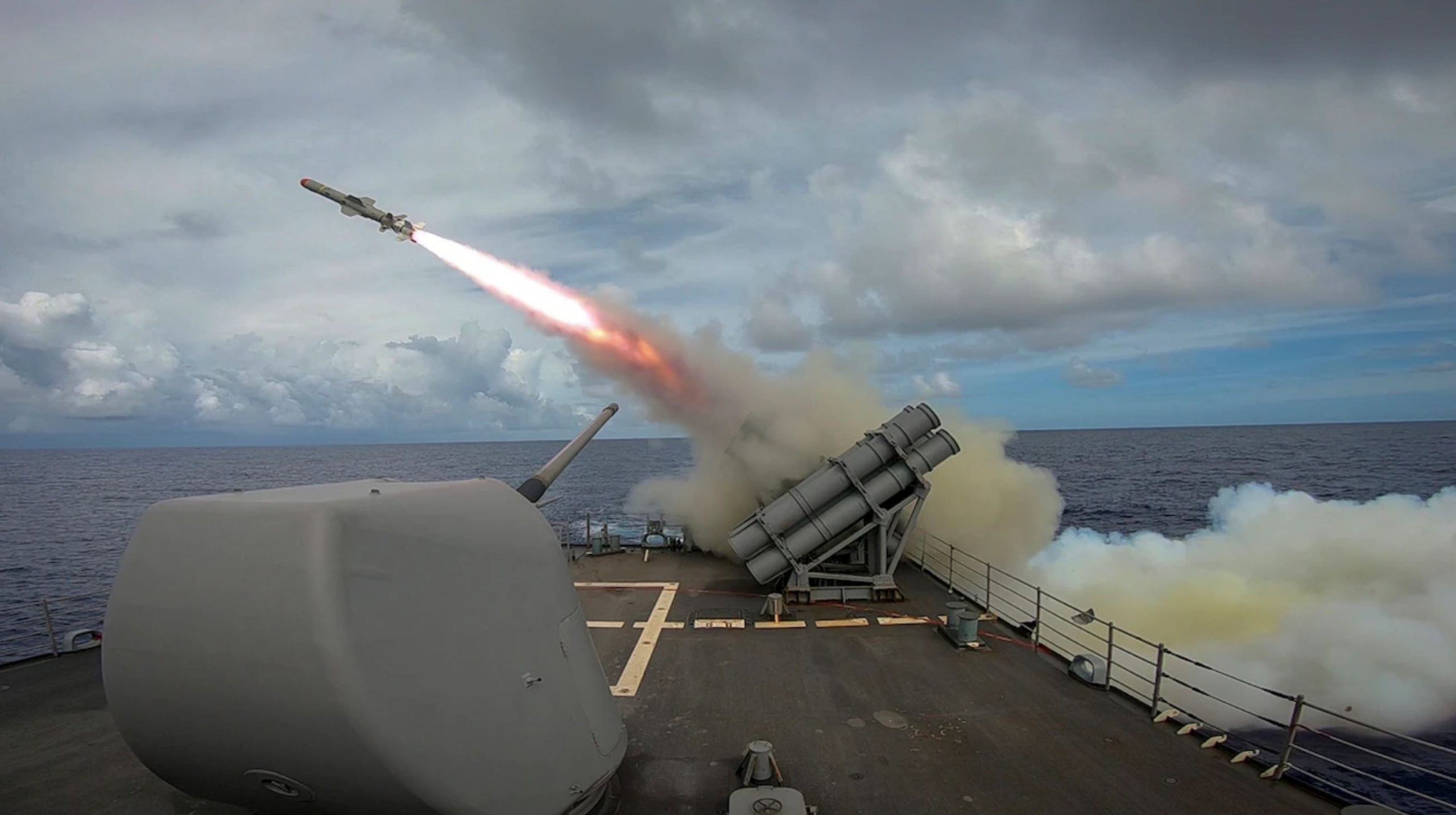 The guided-missile cruiser USS Chancellorsville fires a Harpoon/Stand-Off Land Attack Missile from its fantail in support of the Valiant Shield exercise in the Philippine Sea, Sept. 23, 2018. The Pentagon plans to provide Ukraine with two Harpoon Coastal Defense Systems. Image Credit: Navy Petty Officer 2nd Class Sarah Myers