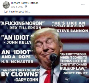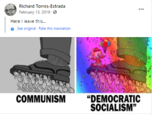 The image above was taken directly off Mr. Torres-Estrada’s Facebook page. One person commented, “You should remove this. Your posting shows us all that you are not fit for your job. You are causing division with pathetic postings like this. You should be ashamed of yourself for causing more problems in this country. I hope and pray you will clean up your social media and have respect for others.”