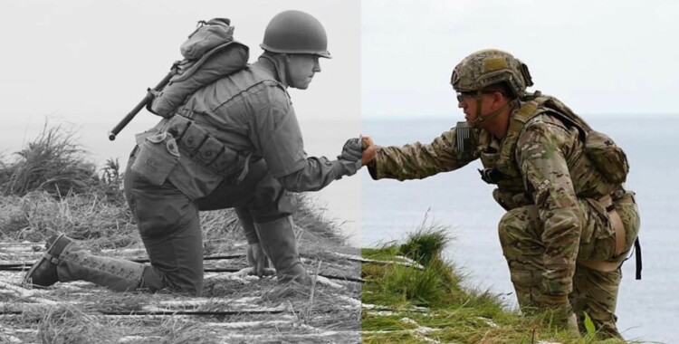 Today, on this 80th anniversary of D-Day, our Pic of the Day features a depiction of a World War II Ranger helping his modern-day brother over the top at Pointe du Hoc, France.