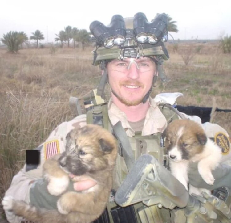 Clay Othic, US Army Ranger and Delta Force Operator is pleased to rescue to stray puppies in Baghdad circa 2005.