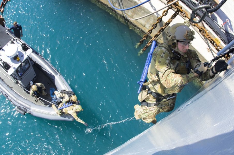 Force Reconnaissance Marines assigned to Force Reconnaissance Company, 3rd Reconnaissance Battalion, 3rd Marine Division, III Marine Expeditionary Force along with British Royal Marines with J Company, 42 Commandos and Sailors assigned to Explosive Ordnance Disposal Mobile Unit 5 (EODMU-5) conduct special insertion and raid training on the submarine tender USS Frank Cable (AS 40) moored at Naval Base Guam, March 21, 2018. The units are conducting joint-combined training in order to develop shared standard operating procedures in a visit, board, search and seizure environment so they can provide a more flexible and mission-ready capability to geographic combatant commanders in the Pacific. EODMU-5 is assigned to Commander, Task Force 75, the primary expeditionary task force responsible for the planning and executing coastal riverine operations, explosive ordnance disposal, diving engineering and construction, and underwater construction in the U.S. 7th Fleet area of operations.