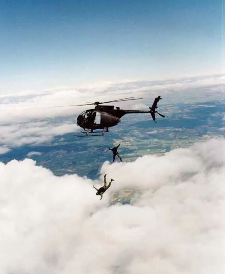 Nothing to see here, just two guys in black helmets jumping into the clouds from a tiny helicopter. Photo from Geo Hand.