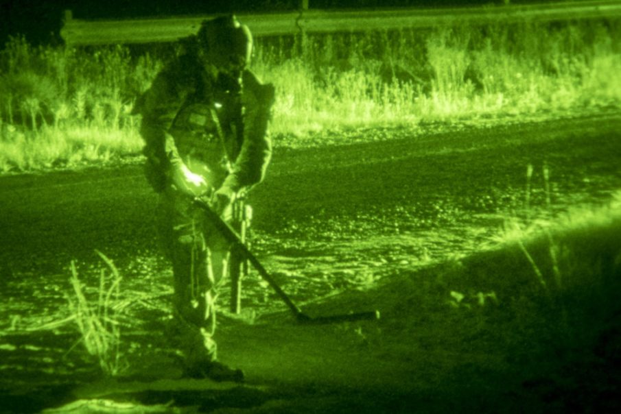 East coast members of Naval Special Warfare uses a metal detector to search for possible improvised explosive devices on a road while conducting an exercise May 11, 2017 at Camp Shelby, Miss. during TRIDENT17. TRIDENT 17 is NSW’s premier joint training event that encompasses several Special Operations Forces and conventional military participants, as well as partner nations and partner agencies to create realistic, combined-effort scenarios for operational units.