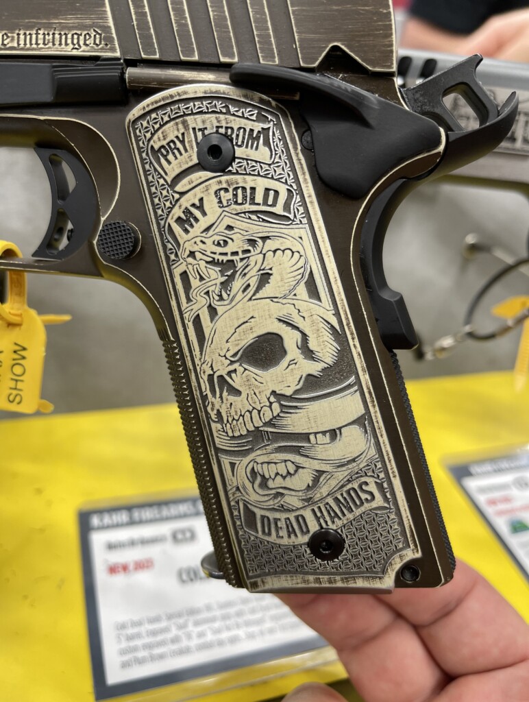 My “favorite pistol of the show” award goes to the new for 2023 Kahr Arms “Cold Dead Hands 1911”. The beautiful engraving you see here in the grips is deep enough that you’ll have no trouble keeping it in your hand as you shoot. You’ll want to display this baby, but you’ll want to fire it as well. It has what I’ll call a functional aesthetic.