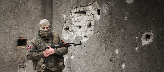 A rebel of the Donetsk People’s Republic (DPR) on the territory of the market in a town in Dobas destroyed by shelling. Photo: RIA Novosti