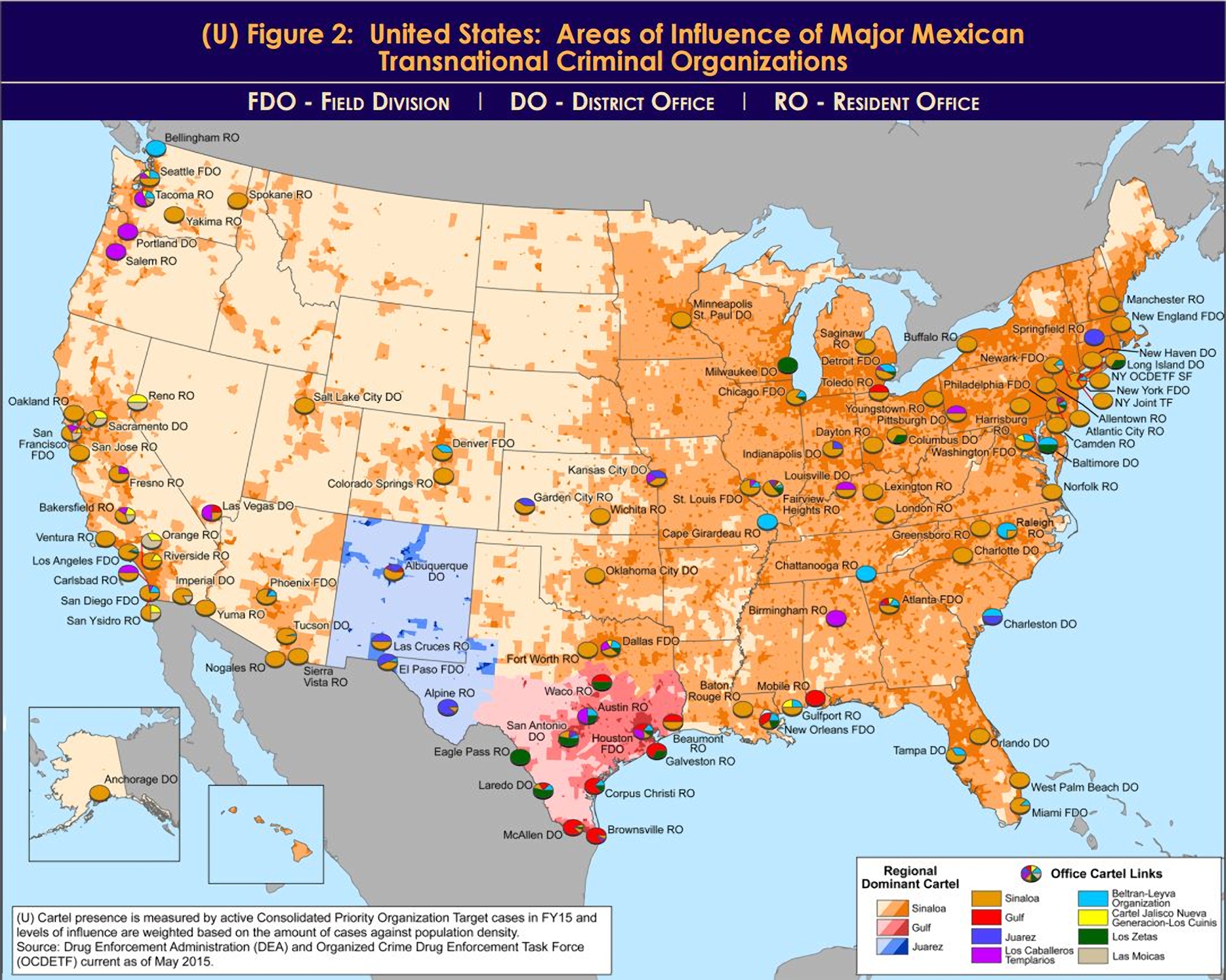This map is taken from the Drug Enforcement Administration’s most recent intelligence report, published in July, outlining the areas of U.S. influence of Mexico’s largest drug cartels. The orange and light-orange chunks covering nearly the entire map, including Alaska and Hawaii, represent the areas of the United States where Guzman’s Sinaloa cartel is the dominant Mexican cartel controlling the illegal trade. – The Huffington Post