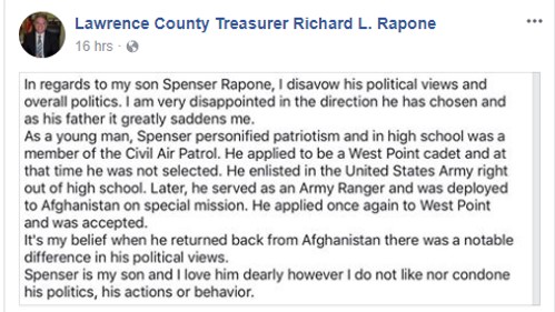 Rapone’s father, Richard Rapone, released a statement on Facebook disavowing his son’s politics and statements. “In regards to my son Spenser Rapone,” he wrote, “I disavow his political views and overall politics. I am very disappointed in the direction he has chosen and as his father it greatly saddens me.”