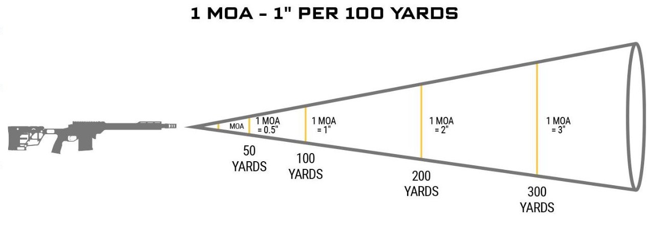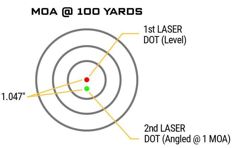 Picture this: you’re holding two laser pointers side by side. One’s dead straight, and the other tilts down just a tad, precisely one MOA. At 100 yards, that tiny tilt means the second laser’s beam hits one inch lower than its straight-shooting buddy. And this relationship grows with distance – two inches at 200 yards, ten at a thousand, and it keeps going.