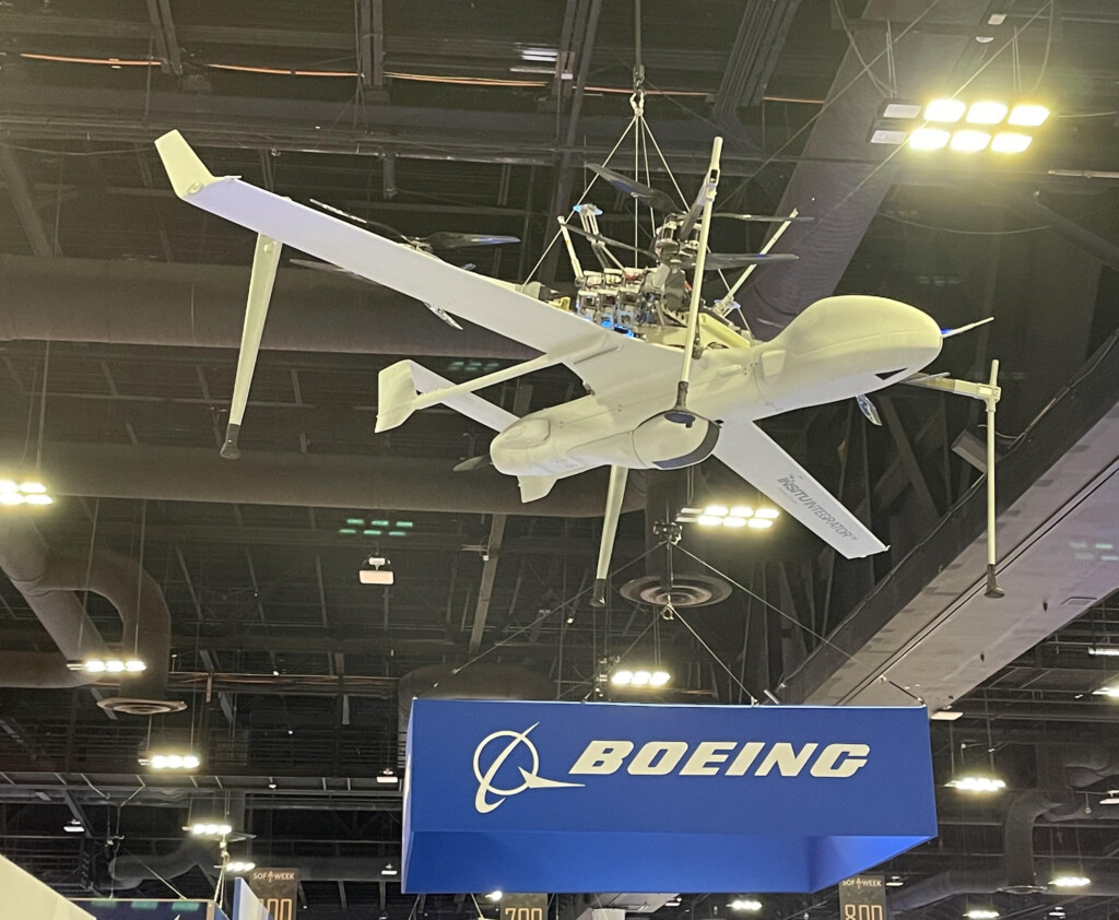 Immediately upon entering the upper exhibition hall, you see the latest offerings from Boeing. Hanging there, as if in mid-flight and right above a sign that read “absolutely no photography” (just kidding), was the Integrator Extended Range-Insitu unmanned aerial vehicle (UAV). You’ll note the bulbous SATCOM (satellite communications) nose module up front with a NASA scoop on the underside. These UAVs are pretty small, actually, measuring a little over 15 feet wingtip to wingtip with a maximum takeoff weight of 165 lbs.
