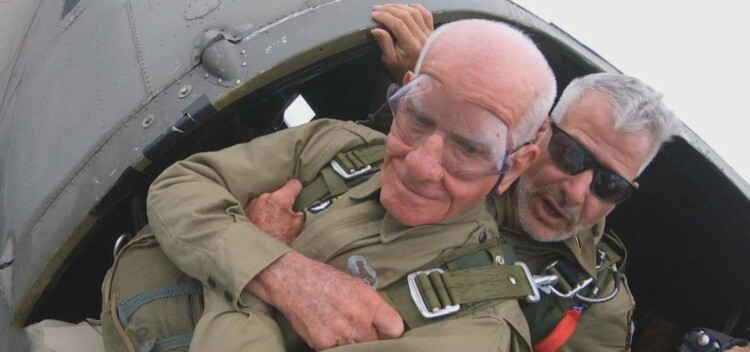 Tom Rice (left) is shown here making a jump on the 75th anniversary of D-Day at age 97.