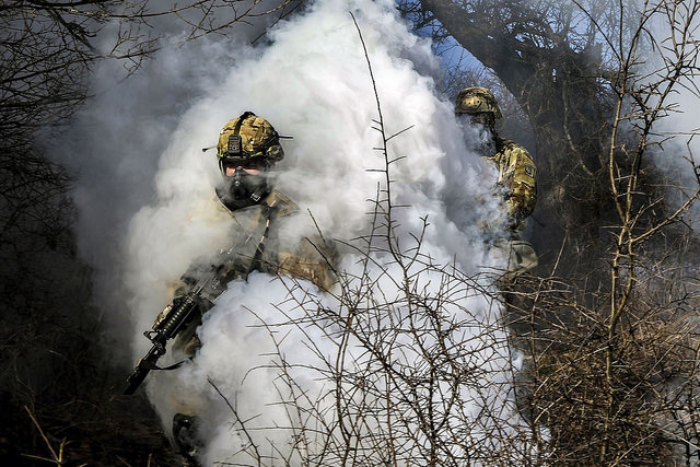 U.S. Army Soldiers push through smoke from a grenade during the ground tactical movement portion of the Operation Bowie Strike training exercise in Zhegoc, Kosovo, Jan. 19, 2018. U.S. Army photo by Staff Sgt. Nicholas Farina. Watch U.S. and Polish troops train together in Operation Bowie Strike below: