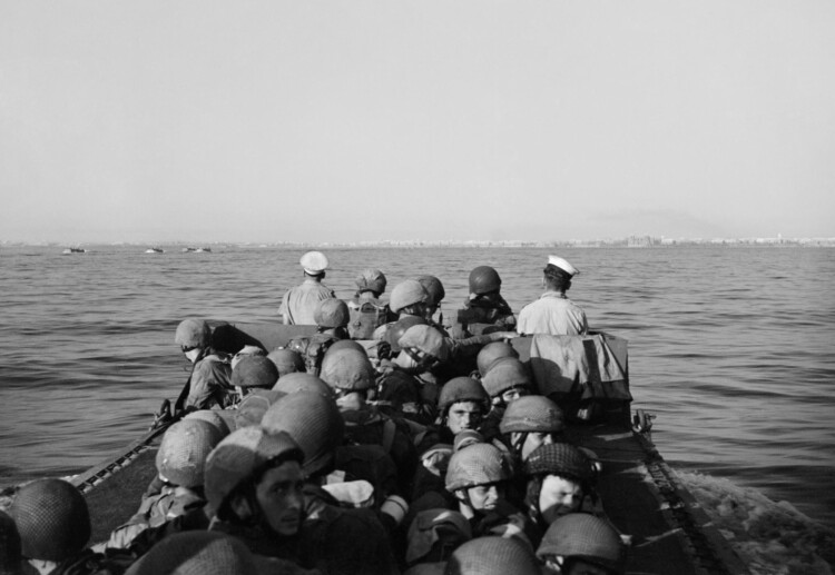 Here we see the view from a British landing craft as it approaches Taranto harbor, Italy on September 14th, 1943 as part of Operation Slapstick. No one laughing on that boat, however.
