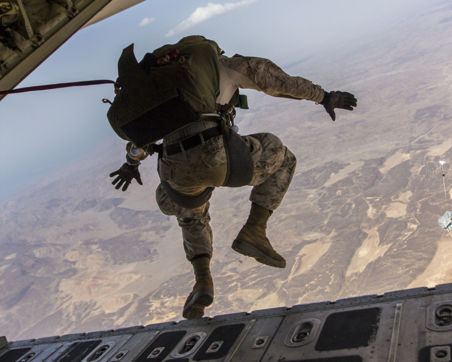 (Featured Image Courtesy: DVIDS. A 26th Marine Expeditionary Unit (MEU) Maritime Raid Force Marine conducts double bag static line parachute operations from a KC-130J Super Hercules assigned to Marine Aerial Refueler Transport Squadron (VMGR) 352, over Djibouti, Aug. 10, 2013. The 26th MEU is a Marine Air-Ground Task Force forward-deployed to the U.S. 5th Fleet area of responsibility aboard the Kearsarge Amphibious Ready Group serving as a sea-based, expeditionary crisis response force capable of conducting amphibious operations across the full range of military operations. U.S. Marine Corps photo by Sgt. Christopher Q. Stone, 26th MEU Combat Camera/Released)