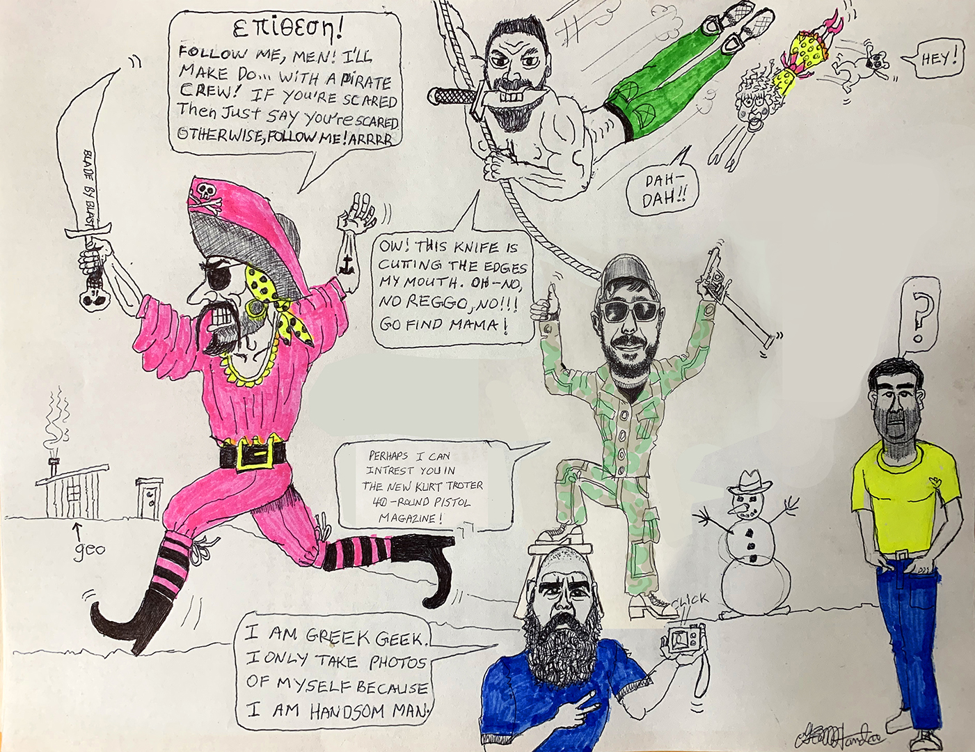 The debut of the SOFREP Team Room cartoon feature depicts Managing Editor Stavros Atlamazoglou clad in flamboyant pirate attire leading his mob of writers, termed his “pirate crew,” forward into the resurrected SOFREP format. Against odds, “Charge!” he cries out in his native Greek language.