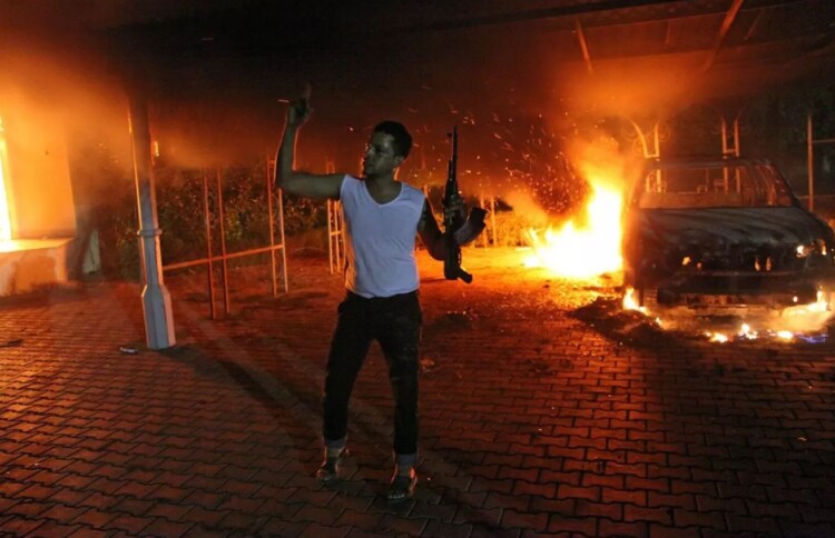 In this September 11, 2012 photo a man with a weapon stands among burning cars and structures inside the US Consulate compound in Benghazi, Libya.