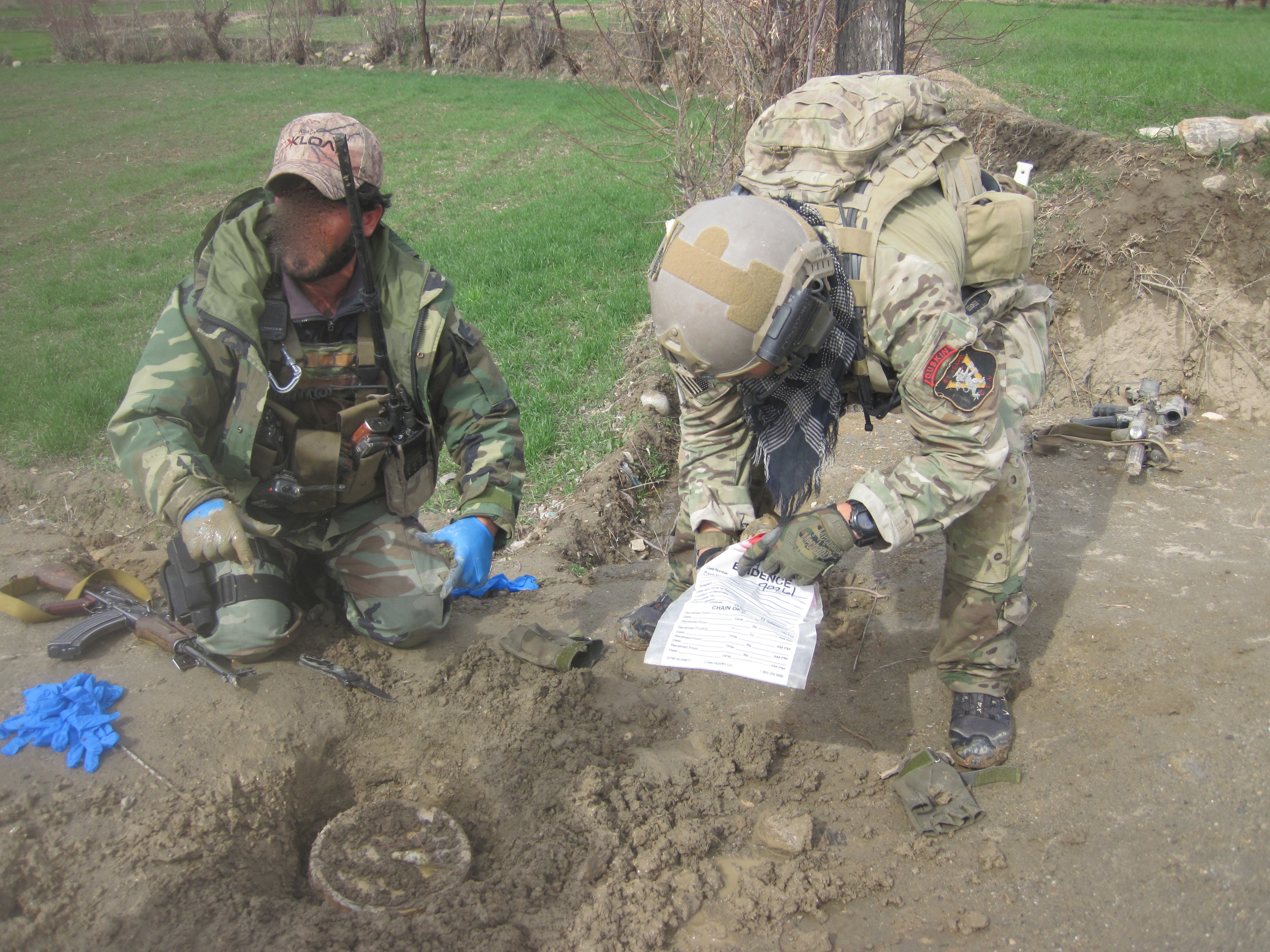 Third Special Forces Group (Airborne) Green Berets disarm an Improvised Explosive Device while on patrol during a recent tour of duty in Afghanistan. Many of the team members wore SOG Recon Team patches.