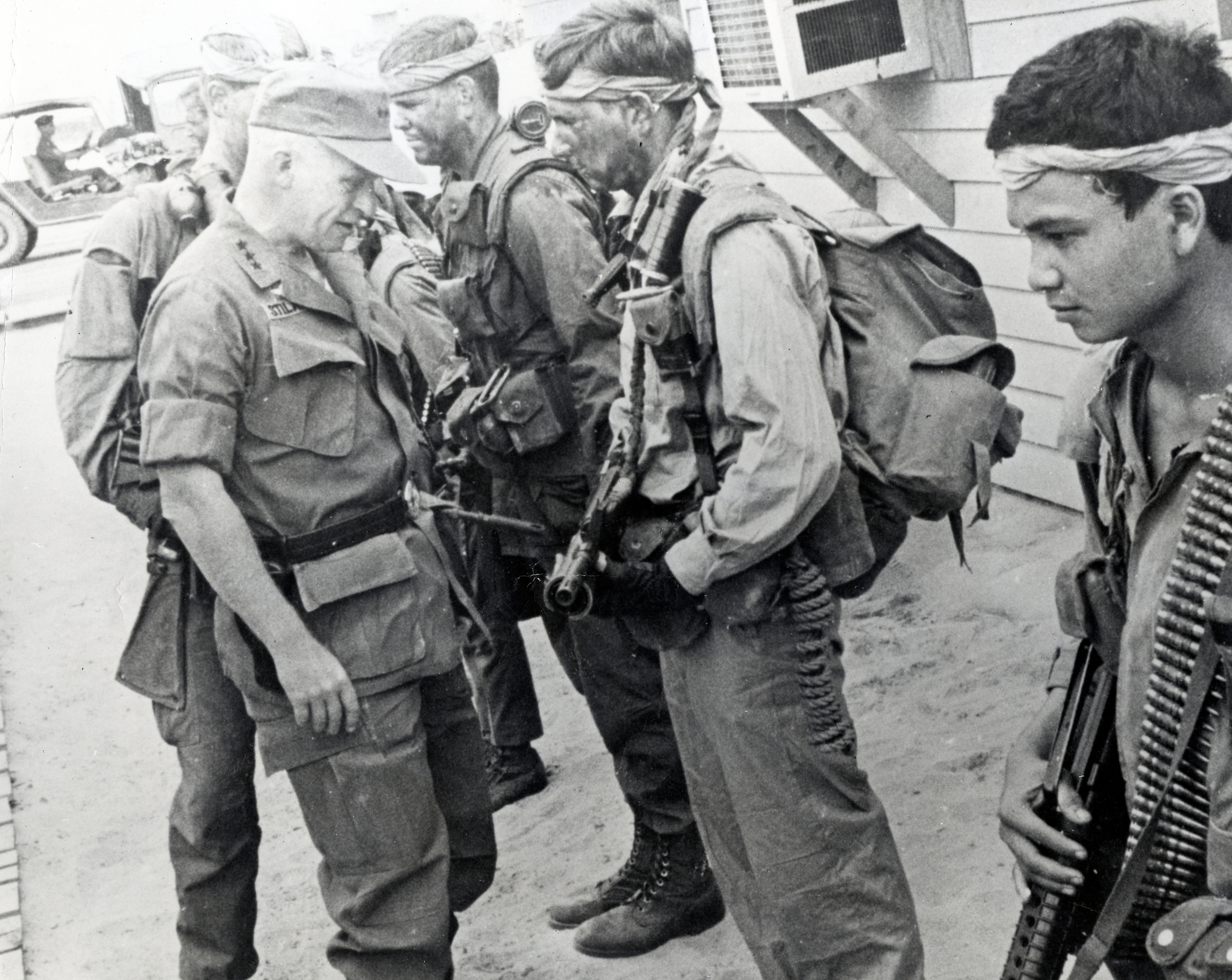 In April 1969, at CCN - the secret SOG compound in Da Nang, RT Idaho Green Beret Doug LeTourneau is queried by LTG Richard Stilwell, about a pending mission that RT Idaho was preparing to run in Laos. In the foreground is indigenous team member Cau, carrying 7.62 mm ammo for the M-60 machine gun and a CAR-15. To the right of LeTourneau is Capt. Michael O'Byrne. Stilwell inspected the team outside the CCN headquarters.