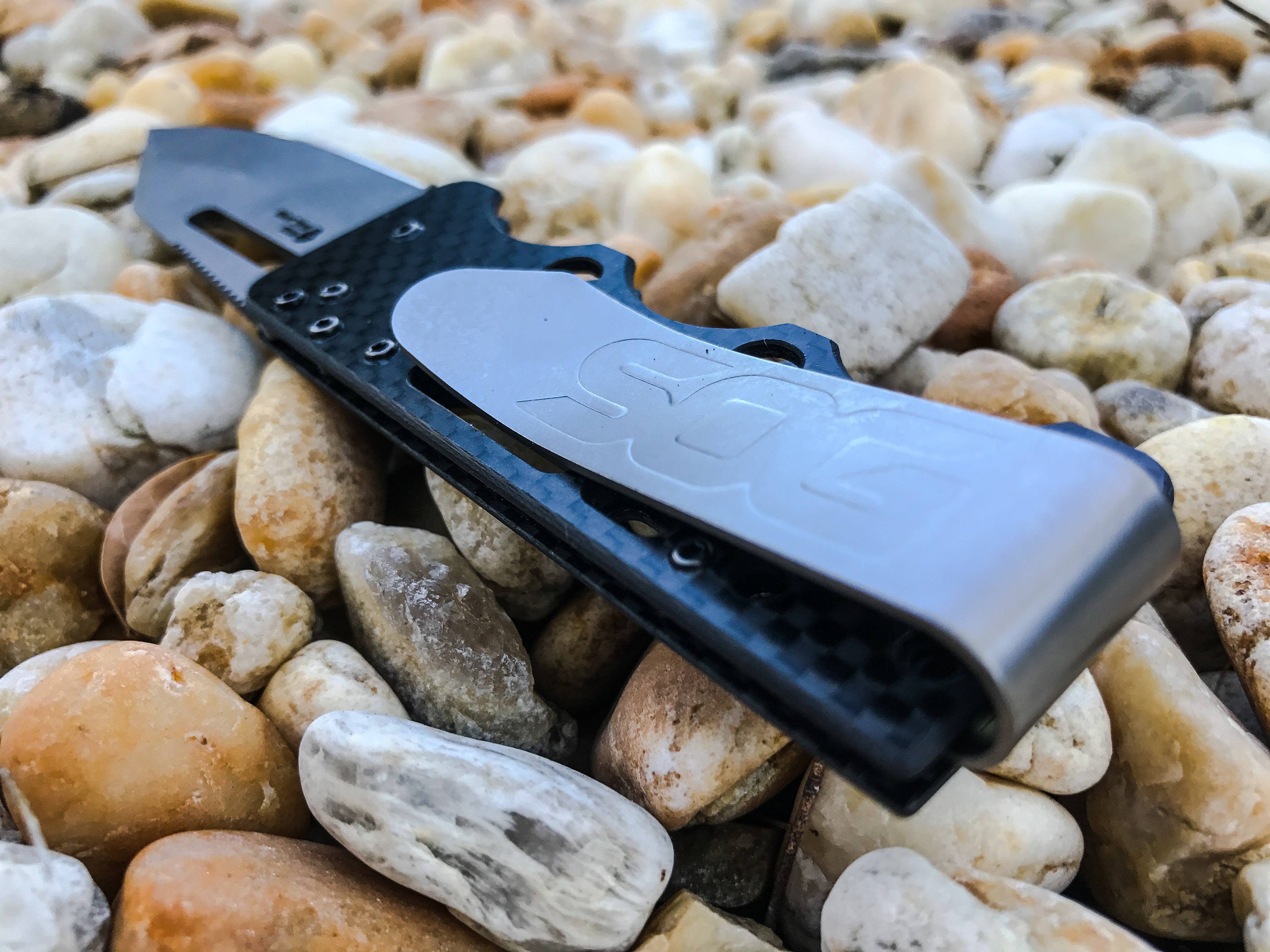 Fortunately, SOG is well represented by White Raven Communication, a PR firm that we love working with. And before long, a box from SOG arrived with a few new products to test. Utilizing some of my favorite exotic materials like carbon fiber and titanium, SOG designers were able to keep the weight of this mini folder to a mere 1.3 oz. About the same weight as 6 quarters in your pocket. Another design feature is the flat carbon handle maintaining an ultra low profile to minimize printing. Additionally, this flat surface is one of the reasons it can serve double-duty as a money clip.