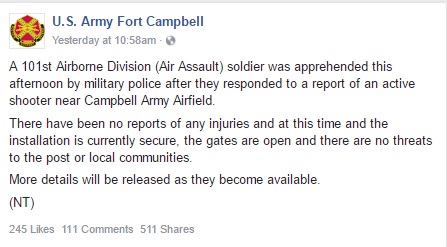 Soldier arrested after report of active shooter at Fort Campbell – Home of the 101st Airborne