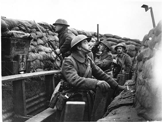 Posed photograph in a trench showing British troops using trench periscope and trench mirror to view no man’s land. (John Warwick Brooke, Public domain, via Wikimedia Commons)