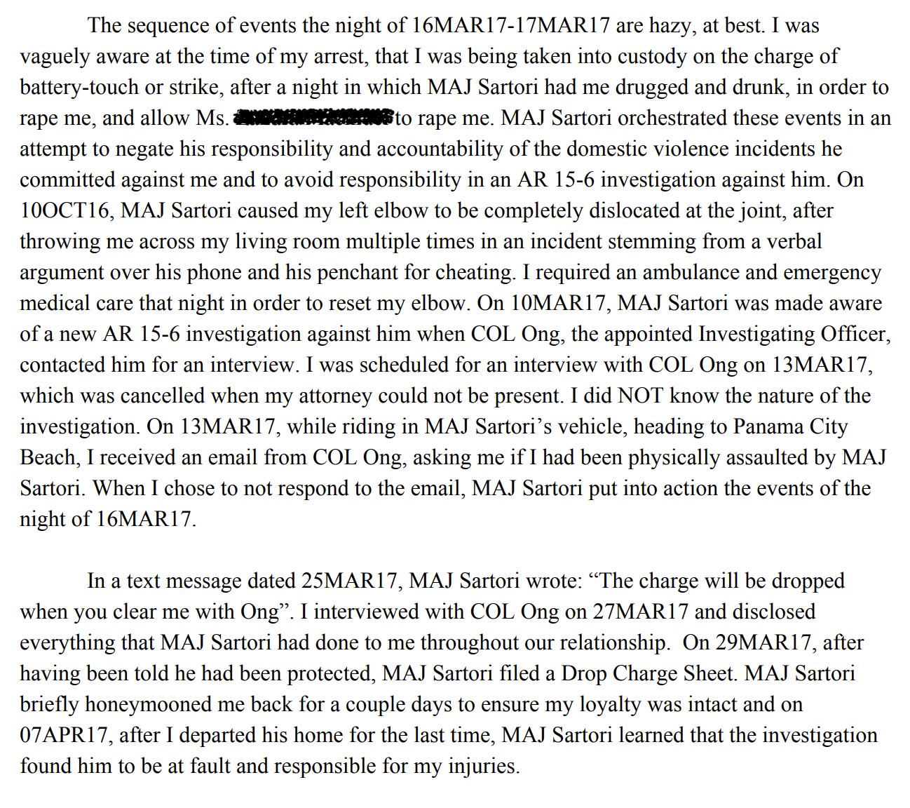 Regarding alleged drug use, O’Brien claims in her rebuttal that what another soldier saw her inhaling was simply crushed diet pills. As far as the DOD allegations about personal conduct, O’Brien states she was merely defending herself from Major Sartori and relates a chilling narrative about the night of March 16-17 of 2017 in which she claims Major Sartori drugged her so that he and an enlisted female soldier in the Air Force could rape her. This was allegedly done in order to retaliate against Ms. O’Brien for reporting past physical abuse suffered at the hands of Sartori, abuse that appears substantiated by photographs previously published by NEWSREP.
