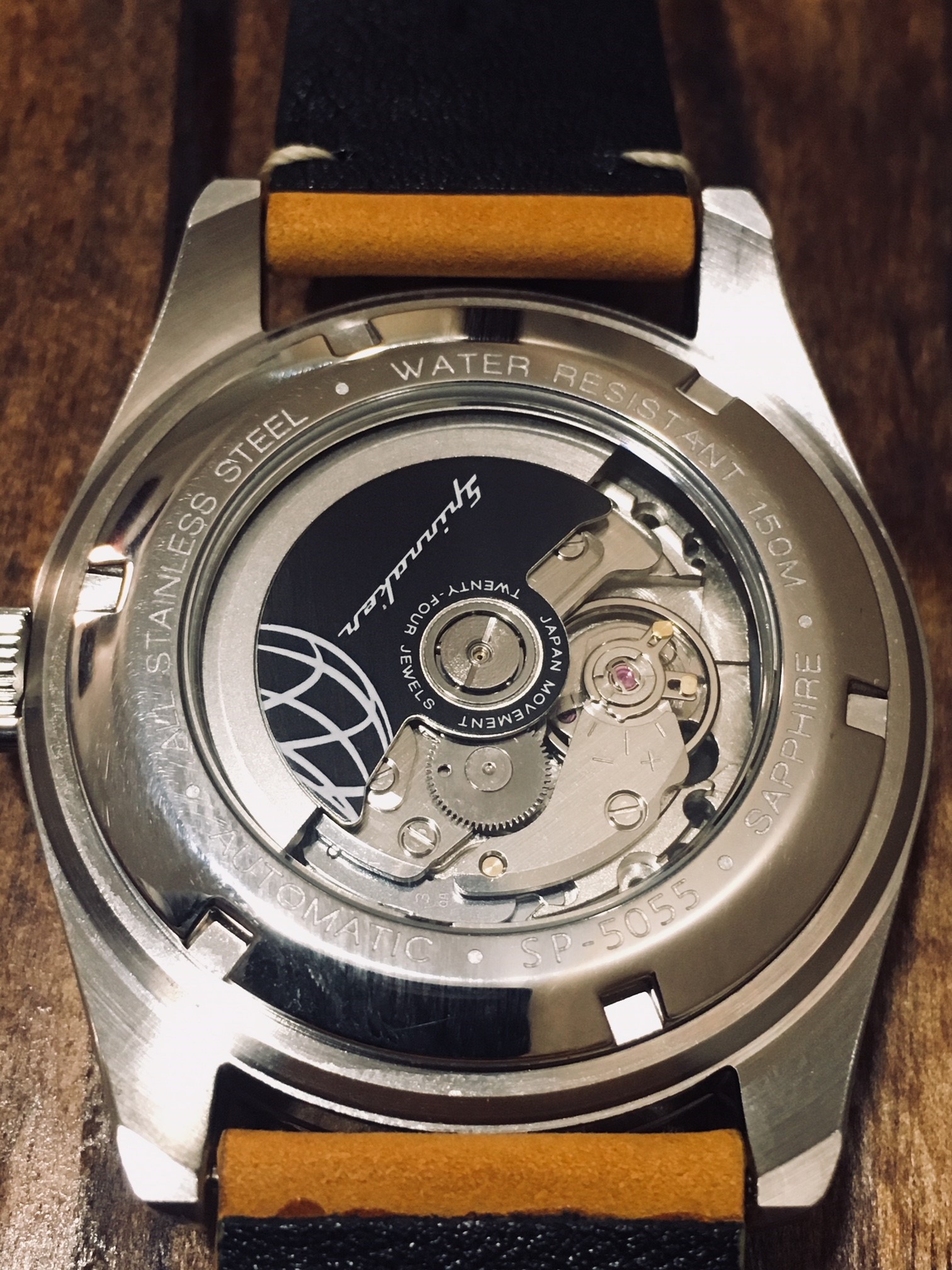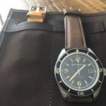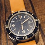 My first impression was that I couldn’t believe they were only charging $285 for an automatic watch with this level of quality. It simply looks and feels great. The watch uses a Seiko TMI NH35 (Japanese) movement with minute, hour, and second hands. Each watch in the Fleuss series features a different color combination for face, bezel, and strap. The SP-5505-05 has a navy blue bezel and face, off-white hands and dial markers, and a brown leather strap with a yellow tint to it.
