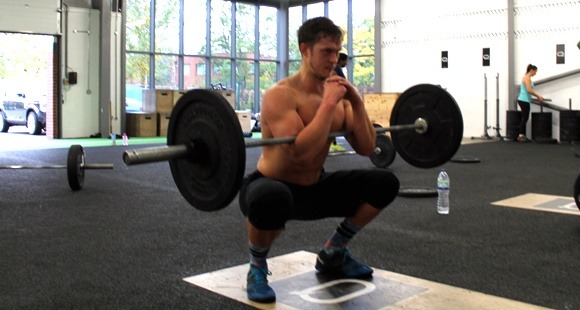 Step 2: Place your feet slightly wider than a normal back squat, and squat down as low as possible. Make sure your torso is upright, and your hips are directly underneath you. Also, be mindful that your torso will be pulled forward by the weight, so you’ll have to resist that. Your elbows should fall inside your knees. If not, that means your stance is too narrow.