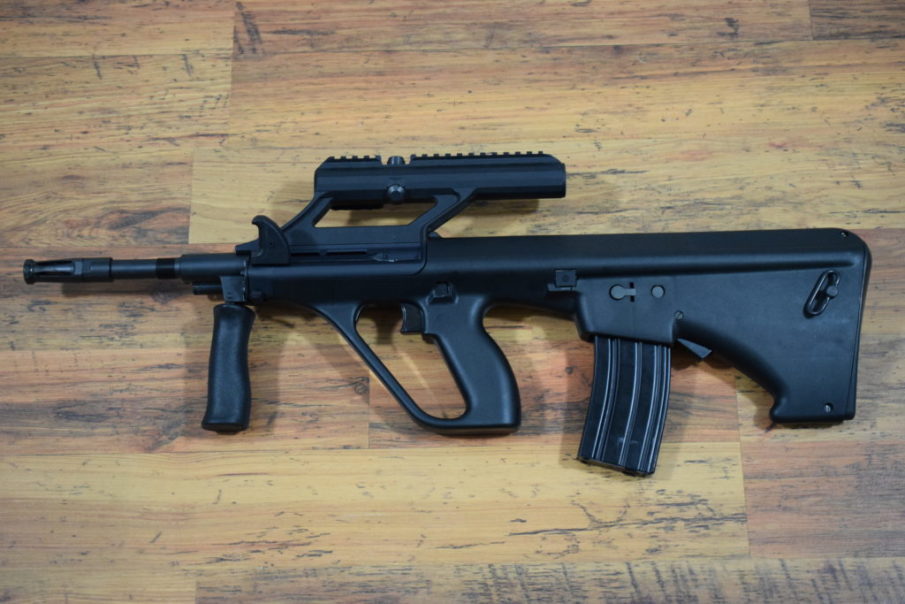 The most common version of the AUG is in it’s assault rifle format. This usually means that the rifle is outfitted with a 20″ barrel and a 30 round magazine. The carbine barrel length on the AUG is 16”, which is the standard length of the AUG A3 rifles. Also, the standard setup for this variant of the AUG is a receiver that sports an integrated 1.5x magnified optic or a rail that allows you to mount whatever type of optic you find desirable.