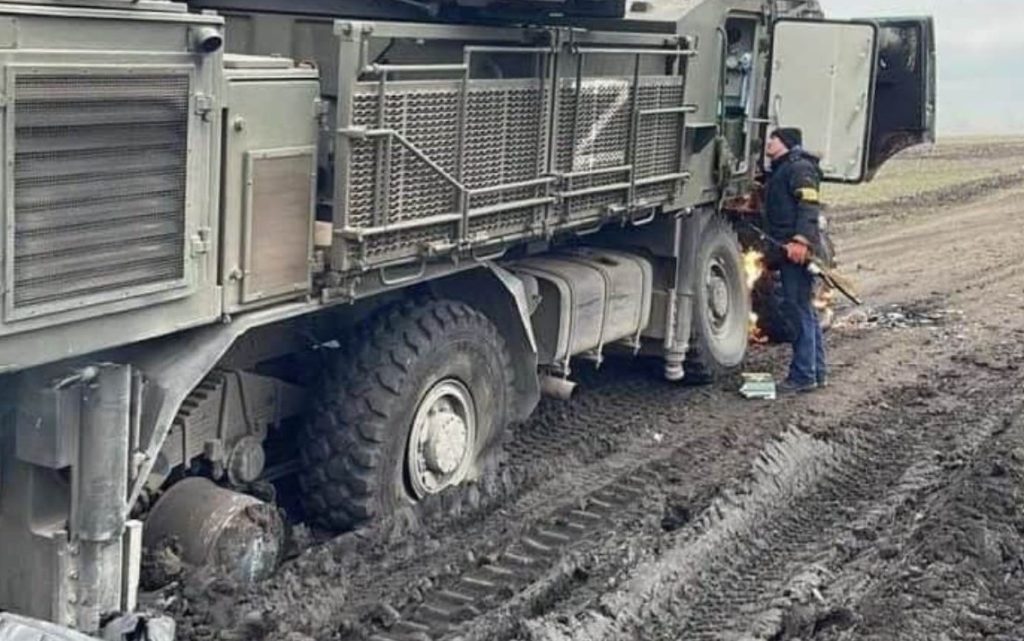 Russian army vehicle stuck in the mud in Ukraine. Rotted tires and poor maintenance are probably contributing factors to this breakdown.