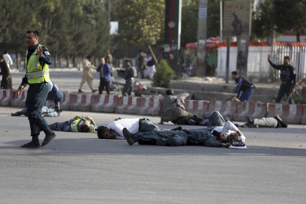 Afghan security personnel and traffic police lie on the ground after a suicide attack near the Kabul Airport, in Kabul, Afghanistan, Sunday, July 22, 2018. | AP Photo/Rahmat Gul