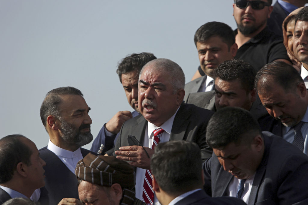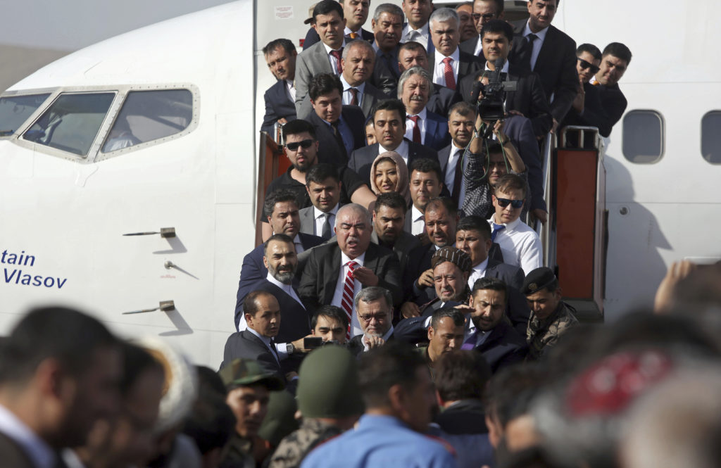 Afghan first vice president, a former Uzbek warlord Gen. Abdul Rashid Dostum, in red striped tie, and members of his entourage disembark on arrival at Kabul International Airport in Kabul, Afghanistan, Sunday, July 22, 2018. | AP Photo/Rahmat GulAbdul Rashid Dostum among his entourage. | AP Photo/Rahmat Gul