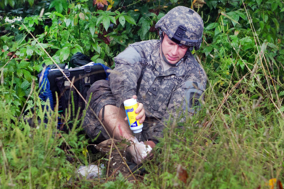 My foot preparation went like this: I painted my feet evenly with tincture of benzoin, all the way up to where the top of my boot would end. I applied a woman’s nylon shorty stocking directly to the tinctured foot. I pulled on a pair of standard-issue U.S. Army socks, OD green in color, one pair. I laced up my boots and started walking. At the end of the day, it all came off, went into the trash, and the same procedure was followed the next day.