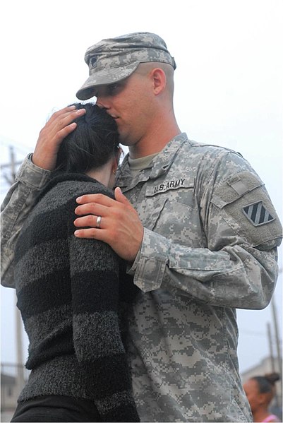 SPC Nathan Stephenson of the 3rd Heavy Brigade Combat Team gives his wife, Moran, a final embrace Friday at Kelley Hill shortly before boarding a bus for Lawson Army Airfield.