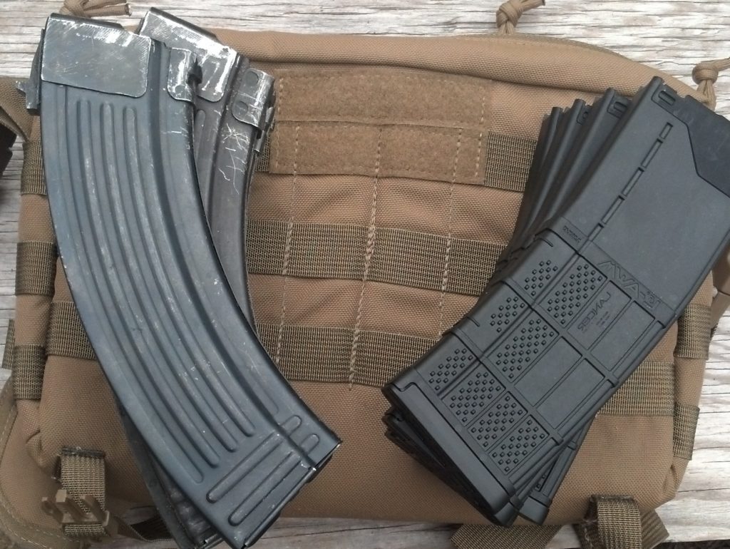 AR magazines are easy overall to draw because they are smoother. AK magazines are longer and find the hands easier, but the lug on the back tends to catch the elastic band. A little jiggle frees it.