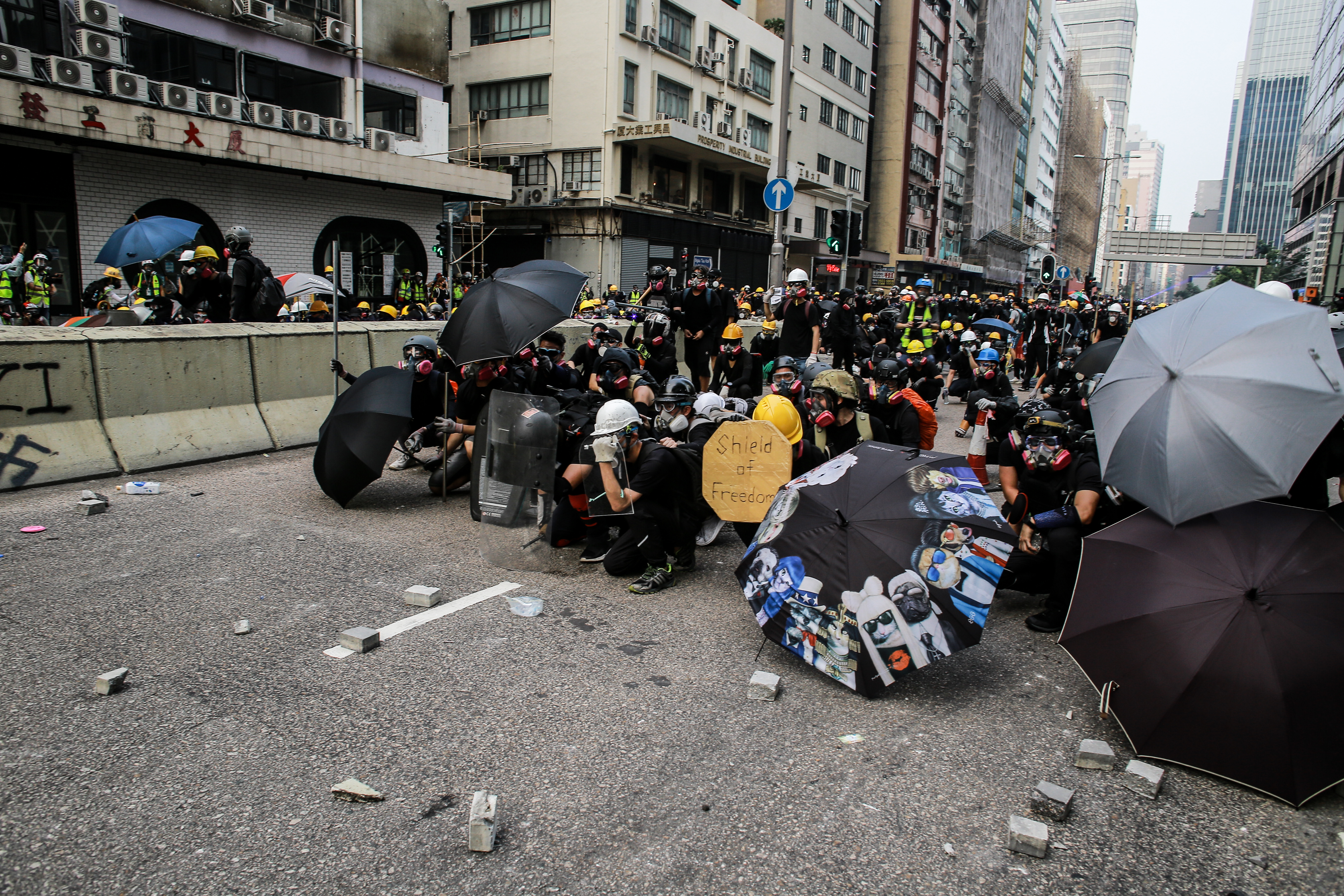 Protesters organize in small groups to protect themselves from rubber bullets, tear gas and power hoses outside the Legislative Council Building on August 31st.