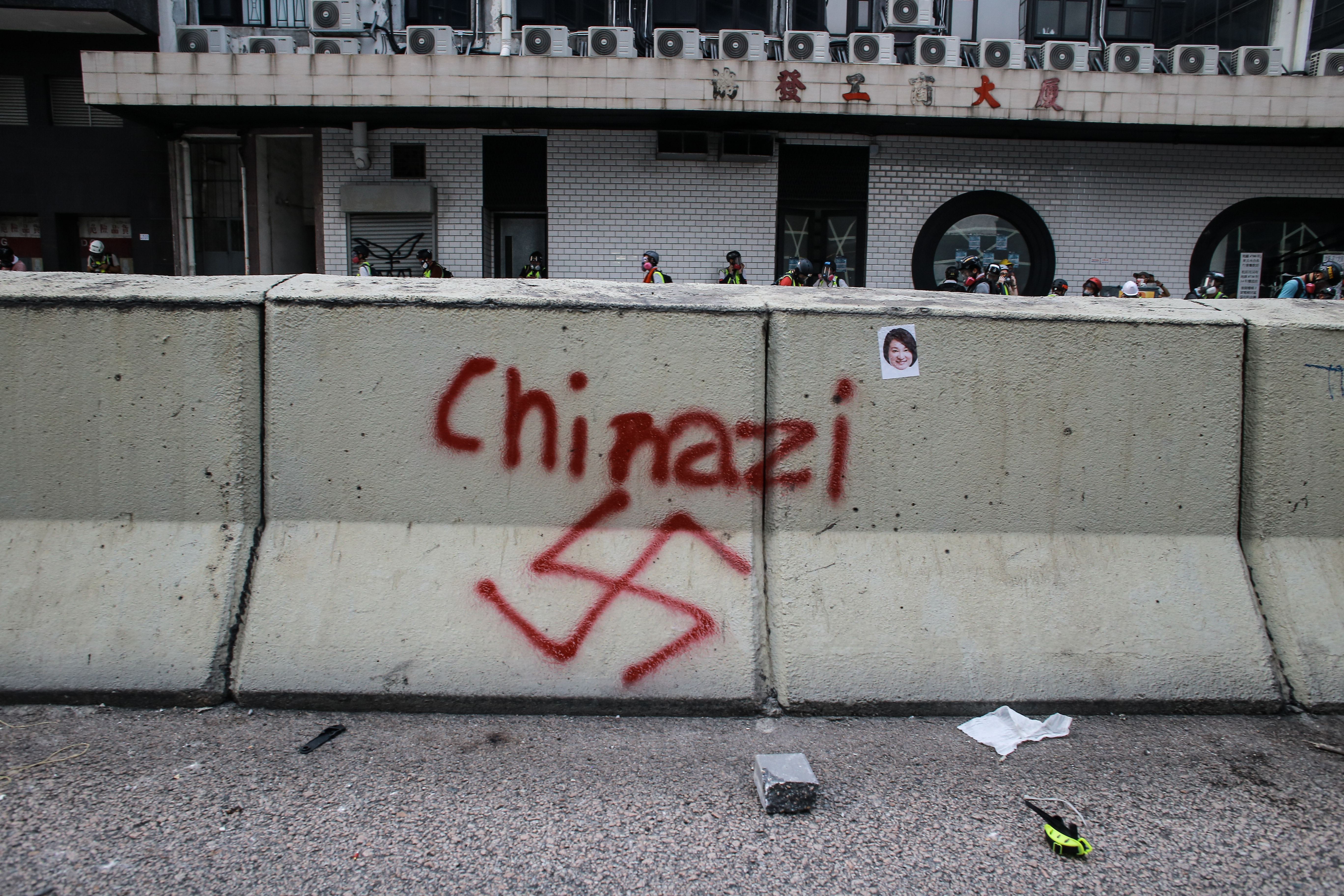 “Chinazi” is a term coined by protesters to relate the Chinese government and Hong Kong Police the fascist Nazi group.