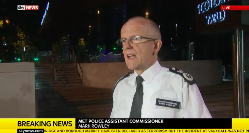 Update 10:52 pm EST: During a press conference, the Metro Police Assistant Commissioner Mark Rowley confirmed that three men in a van struck several pedestrians on the London Bridge. After crashing the vehicle, the three men exited the vehicle in Borough Market and began to attack several people with knives, including a police officer. Within eight minutes of police receiving the initial notification of the attack, the three terrorists were shot and killed by police. He also confirmed that the three men were wearing fake explosive devices. Rowley stated six people in addition to the attackers died in the attack and at least 20 people were injured. The identities of the attackers and the victims have not been released yet.