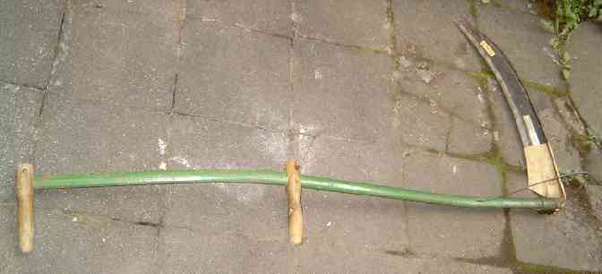 A modern scythe of a pattern common in parts of Europe. (Kku, CC BY-SA 3.0, via Wikimedia Commons)