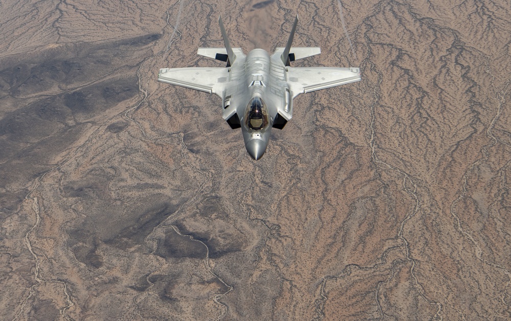 LUKE AIR FORCE BASE, Ariz.— An F-35 Lightning II, F-16 Fighting Falcon, F-15E Strike Eagle, and an A-10 Thunderbolt II fly in a four-ship formation over Arizona after being refueled by an Arizona Air National Guard KC-135 Stratotanker from the 161st Air Refueling Wing, June 3, 2021. The 944th Fighter Wing is unique in the fact that they train pilots on four different airframes, with two of them being geographically separated from the unit. The F-15E is out of Seymour Johnson Air Force Base, N.C., and the A-10 belongs to the 924th Fighter Group at Davis-Monthan Air Force Base, Ariz. The 161st ARW is stationed at Goldwater Air National Guard Base at the Phoenix Sky Harbor International Airport, Ariz. (U.S. Air Force photo/ Tech Sgt. Nestor Cruz)