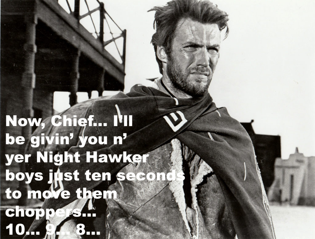 The whole affair put Chief Greg “Gravy” Coker squarely in mind of Wile E. Coyote and his doggie Sam as they rolled on their backs and howled at the moon with laughter — like coyotes. Such was another day in the office for the six-gunners of the Night Stalkers.