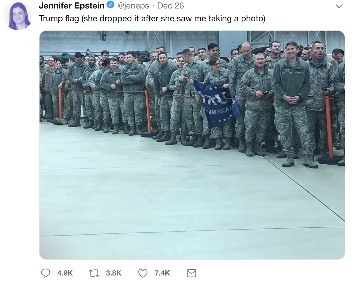 After writing article after article about how Trump failed to visit the troops on or before Christmas eve like past presidents, some members of the press were apoplectic when he actually did. First came the stories about soldiers asking to have their “make America great again” hats signed when the President visited. Jennifer Epstein of Bloomberg posted some alarmed tweets including pictures of four airmen holding MAGA hats and one with a Trump banner. Apparently this was some kind of big scoop, a picture of four airmen waving MAGA hats. A slew of articles about the MAGA hats were soon to follow, journalists pointing out that service members may have been breaking DOD regulations by participating in politics while in uniform.